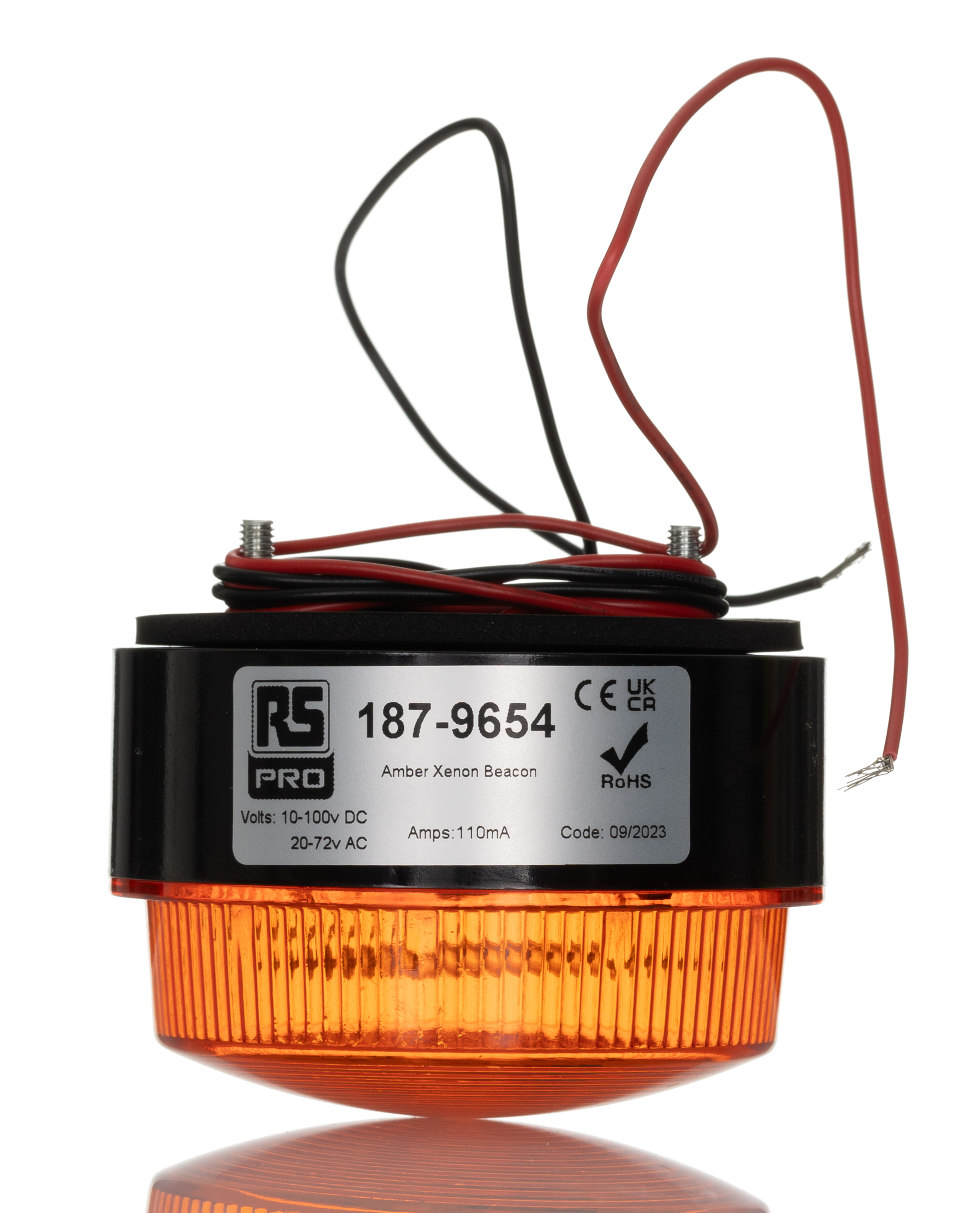 This is Xenon Flashing Beacon Amber Stud Mount Surface Mount 10 → 100 V dc 20 → 72 V ac manufactured by RS PRO. The manufacturer part number is 187-9654. The housing has an adorable black colour. It consumes 110 ma current . The lens has an adorable amber colour. It includes a lamp yes . The product is integrated with a xenon bulb. It is IP rated with ip67. In addition, the height is 50mm. This product harbours ac/dc current. beacon is a versatile product designed to provide user-defined applications. The product requires a maximum 72v ac supply voltage . The product provides a flashing lighting effect. The base diameter includes 76mm. It has a surface, stud mount type mount .