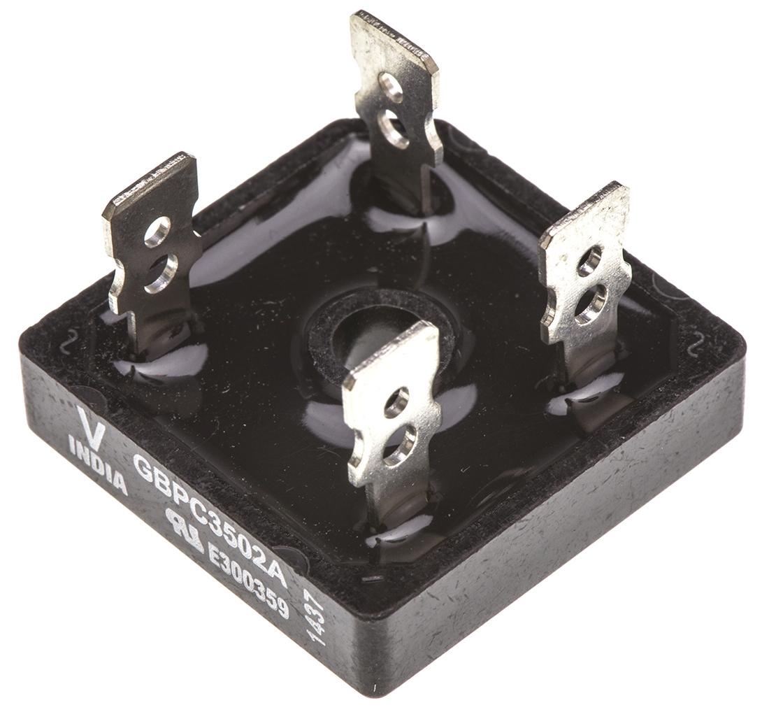 This is Bridge Rectifier 35A 200V 4-Pin GBPC-A manufactured by Vishay. The manufacturer part number is VS-GBPC3502A. The product complies with automotive standard - no. The product is available in single configuration. The product vs-gbpc, is a highly preferred choice for users. In addition, the height is 7.7mm. Furthermore, the product is 28.6 mm wide. Its accurate length is 28.6mm. The package is a sort of gbpc. Whereas, the minimum operating temperature of the product is -55°c. Whereas it is comprised of 1 phases. bridge rectifier is a versatile product designed to provide user-defined applications. It has a maximum operating temperature of 150°c. It contains 4 pins. It has a screw type mount .