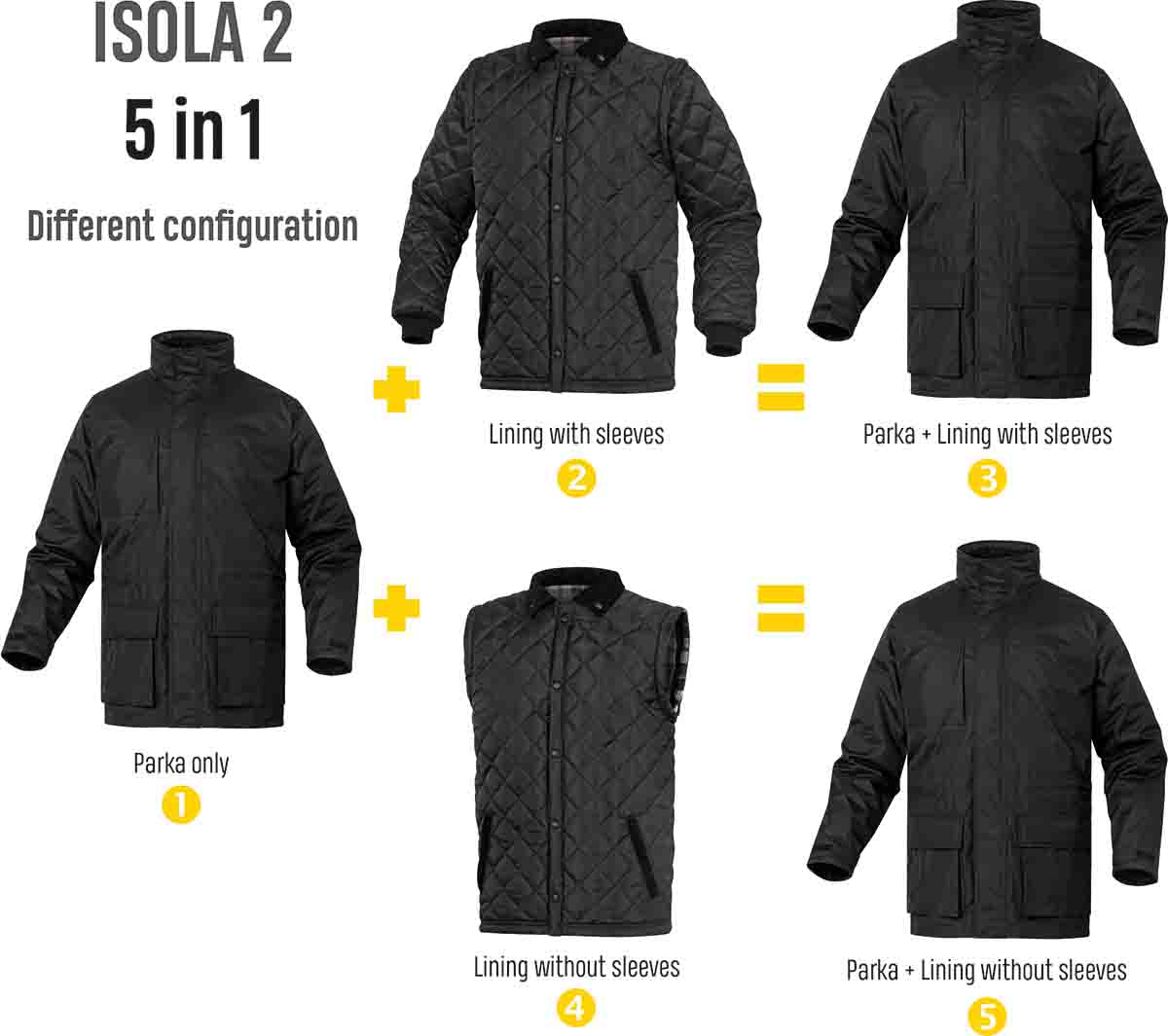 The Delta Plus designed 5 in 1 parka, removable lining. Parka is waterproof seams. Fixed hood and adjustable waist with drawstring. 5 Removable lining with collar with corduroy lining. Removable sleeves and knitted cuffs. Fastening with press studs. Polyester Pongee fabric with PVC coating Fixed polyester Taffeta lining