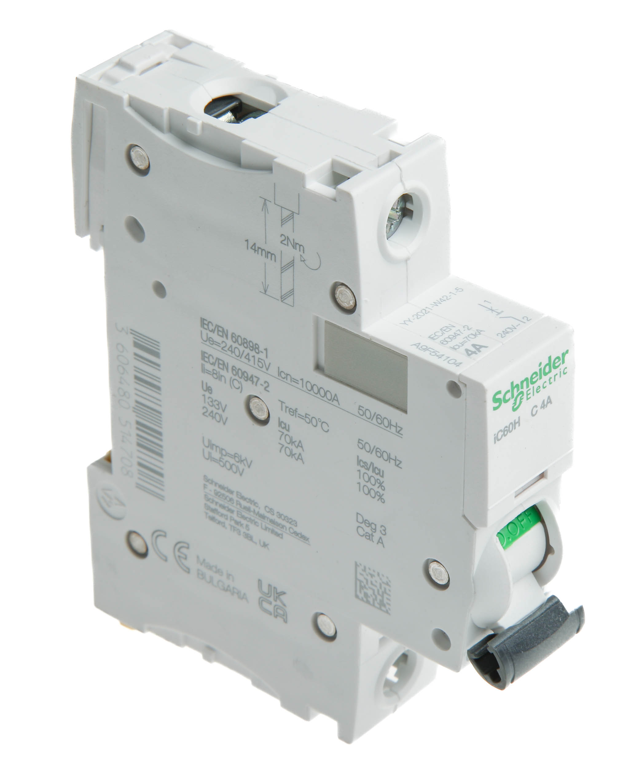 This is Acti 9 iC60H MCB Mini Circuit Breaker 1P 4 A 10 KA Curve C manufactured by Schneider Electric. The manufacturer part number is A9F54104. The product has a current rating of 4 a. It is a rocker reset actuator. It is IP rated with ip20. It utilises thermal magnetic tripping mechanism. The product ic60h, is a highly preferred choice for users. It features acti9 range. In addition, the height is 85mm. The product has a rated DC voltage of 48 v dc. Furthermore, the product is 18 mm wide. The product comes in 78.5mm depth. The product has a rated AC voltage of 240 v ac. It has a/an instantaneous break time . It features 10ka breaking capacity. It allows type c tripping features. miniature circuit breaker is a versatile product designed to provide user-defined applications. It has equipped with 1 poles. The terminal is a screw type. It has a din rail type mount .