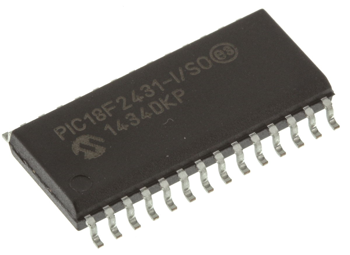 This is 8bit PIC Microcontroller 40MHz 16.384 kB 256 B Flash 28-Pin SOIC manufactured by Microchip. The manufacturer part number is PIC18F2431-I/SO. Furthermore, the product is 7.5 mm wide. In addition, 16kb is the program memory size. In addition, the height is 2.35mm. The product complies with automotive standard - no. It comprises 4 timers. The product has typical 768bit RAM size. Moreover, the data bus width includes 8bit. The instruction set has risc architecture. It is a flash program memory type. It has a minimum 2v supply voltage . The package is a sort of soic. In addition, it has a maximum clock frequency about 40mhz . microcontroller is a versatile product designed to provide user-defined applications. It has a maximum operating temperature of 85°c. On the other hand, the pic is the device core. Its accurate length is 17.9mm. It is a type of sci interface. It contains 28 pins. It has a surface type mount . The product pic18f2431, is a highly preferred choice for users. The product requires a maximum 5.5v supply voltage . The ADCs included 5 x 10 bit. Whereas, the minimum operating temperature of the product is -40°c.