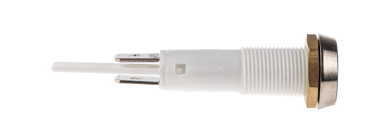 This is Green Neon Panel Mount Indicator 230V ac 10mm Mounting Hole Size manufactured by Arcolectric (Bulgin) Ltd. The manufacturer part number is C027500NBC. Regarding light output colour, it outputs green light colour. It is IP rated with ip67. Furthermore, the bezel has a classic silver colour. The product 0275, is a highly preferred choice for users. Its accurate length is 57.7mm. The bezel features a flush style. It carries a 230 v ac of voltage. The product is designed with a solder tab termination. It is offered with a standard 10 mm mount hole size . panel mount indicator is a versatile product designed to provide user-defined applications. It has a panel mount type mount .