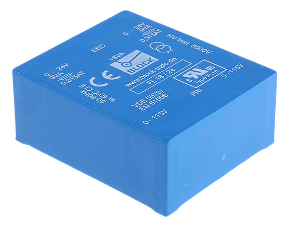This is 24V ac 2 Output Through Hole PCB Transformer 18VA manufactured by Block. The manufacturer part number is FL 18/24. Additionally, the product is supplied with 2 outputs. The typical product's weight is 375g. 18va is the power required . It is a highly efficient product with an 77% of high efficiency. Its accurate length is 68mm. It carries 60hz of maximum operating frequency. Furthermore, the product is 27.6 mm wide. The product comes in 57mm depth. It has a minimum 50hz operating frequency . pcb transformer is a versatile product designed to provide user-defined applications. It has a maximum operating temperature of 40°c. Whereas, the minimum operating temperature of the product is 40°c. It has a through hole type mount .