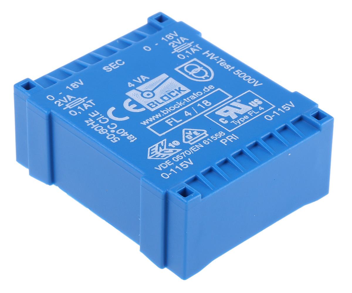 This is 18V ac 2 Output Through Hole PCB Transformer 4VA manufactured by Block. The manufacturer part number is FL 4/18. Additionally, the product is supplied with 2 outputs. The typical product's weight is 145g. 4va is the power required . It is a highly efficient product with an 66% of high efficiency. Its accurate length is 53mm. It carries 60hz of maximum operating frequency. Furthermore, the product is 19.6 mm wide. The product comes in 44mm depth. It has a minimum 50hz operating frequency . pcb transformer is a versatile product designed to provide user-defined applications. It has a maximum operating temperature of 40°c. Whereas, the minimum operating temperature of the product is 40°c. It has a through hole type mount .