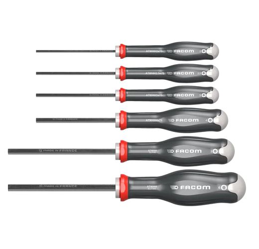 This is 6 pieces Hex Key manufactured by Facom. The manufacturer part number is ATWHH.JT6. The tip is 2 x 75 - 2.5 x 75 - 3 x 75 - 4 x 75 - 5 x 100 - 6 x 100 mm in size. This hexagon screwdriver offers extreme comfort and a non-slip grip. screwdriver set is a versatile product designed to provide user-defined applications. The built-in exquisite tip is a hexagon tip. The product consists of 6 pieces.