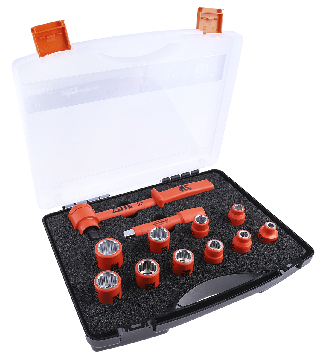 This is 12 Piece Socket Set 1/2 in Insulated Square Drive manufactured by ITL Insulated Tools Ltd. The manufacturer part number is RS_911-1477. VDE/1000V Approval Options - yes. The product is insulated yes . The driver socket offers profound benefits and is well-designed. The product is made from highly stable and reliable nylon 11. The product has a drive size of 1/2 in. Moreover, it has extension, ratchet, sockets set contents . socket set is a versatile product designed to provide user-defined applications. The product features a square drive. The product consists of 12 pieces.