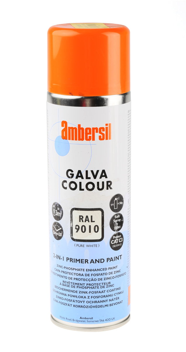 This is White 500mL Satin Finish Galvanised Paint For Use With Anti-Corrosion Primer manufactured by Ambersil. The manufacturer part number is 6190011538. Its RAL code is ral 9010 . It is assigned with a trade name of galva colour. A quality product with a nice satin finish. It has a decent white colour. Its base is made up of water material . Its package size is approximately 500 ml . It has compatible primer materials . spray paint is a versatile product designed to provide user-defined applications.