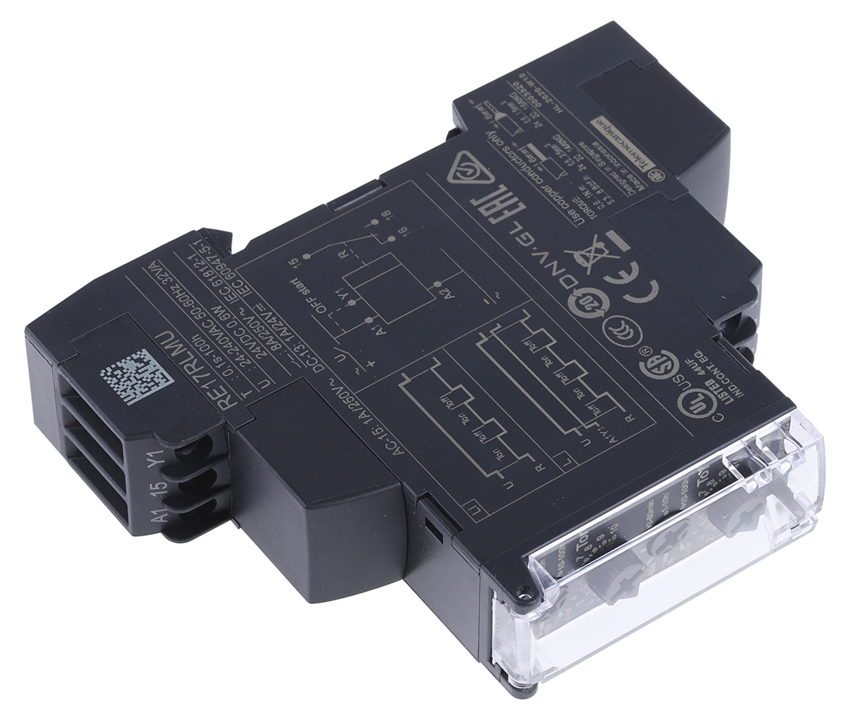 The Schneider Electric RE17RLMU is a high-precision, multifunction timing relay belonging to the Harmony RE17 series, designed to provide flexible control for automated systems. This dual-function device features an asymmetrical flashing capability with two independently adjustable timing periods, ranging from 0.1 seconds to 100 hours. Its slim 17.5mm profile ensures it occupies minimal space on a DIN rail. The wide supply voltage compatibility (24V to 240V AC/DC) makes it a versatile solution for various global industrial standards.