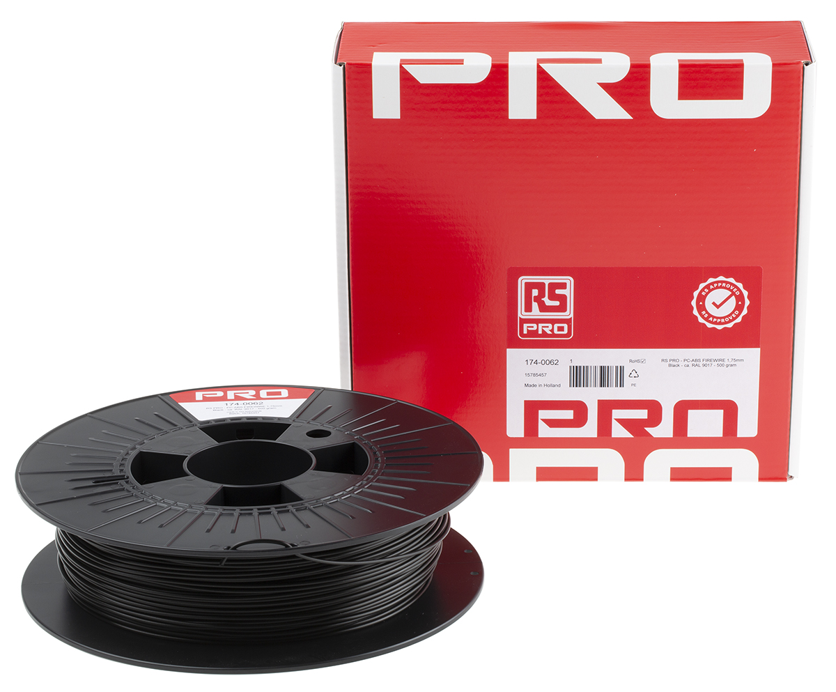 This is 175mm black - ca. RAL 9017 - 500 gram manufactured by RS Pro. The manufacturer part number is 174-0062. It is designed using fdm printing technology . Its diameter is 1.75mm. The typical product's weight is 500g. It is machine specific no . It has a decent black colour. Its material is of abs type . It has the capability to print on pc-abs v0 material . The product is highly suitable for common desktop 3d printers.