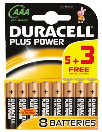 This is Plus Power Alkaline AAA Battery manufactured by Duracell. The manufacturer part number is 5000394018815. The nominal voltage of the product is 1.5v. It has a/an alkaline chemistry . The terminal is a standard type. Its brand range is duracell plus power .