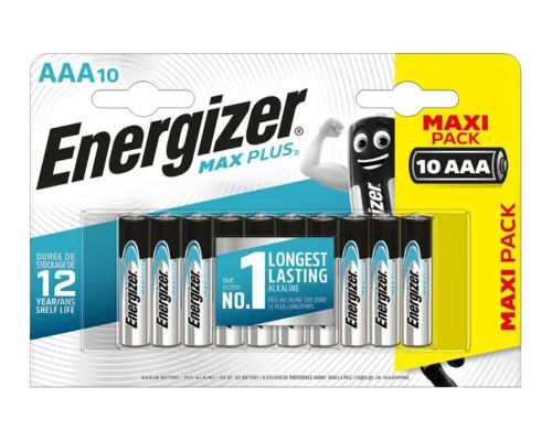 This is MAX PLUS Alkaline Zinc Manganese Dioxide AAA Batteries 1.5V manufactured by Energizer. The manufacturer part number is AAA P10 MAX+. It has a model number lr03. The number of supplied batteries is/are 10 . The nominal voltage of the product is 1.5v. It has a/an alkaline, zinc manganese dioxide chemistry . The terminal is a flat contact type. Its brand range is energizer max plus .