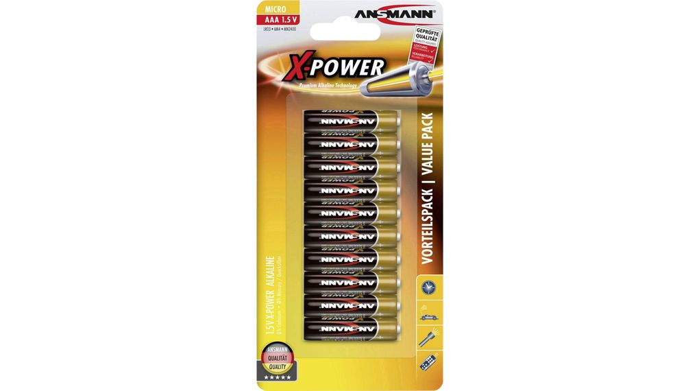 This is Alkaline AAA Batteries 1.5V manufactured by Ansmann. The manufacturer part number is 1511-0009-520. The nominal voltage of the product is 1.5v. It has a/an alkaline chemistry . The number of supplied batteries is/are 10 .