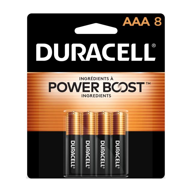 This is Alkaline Manganese Dioxide AAA Batteries 1.5V manufactured by Duracell. The manufacturer part number is MN2400 P8 BOOST. The nominal voltage of the product is 1.5v. It has a/an alkaline manganese dioxide chemistry . The terminal is a flat type. It has a model number mn2400. The number of supplied batteries is/are 8 .