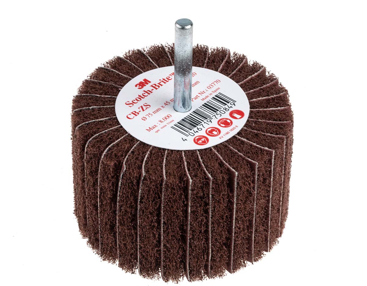 This is Aluminium Oxide Flap Wheel P120 Grit 75mm x 45mm x 6mm manufactured by 3M. The manufacturer part number is 3M450 COMBI 75X45X6 P120. It has a maximum 7500rpm safe speed . Its diameter is 75mm. It has a model cb-zs. The product has a high-quality circular type brush . It has a standard p120 grit size .