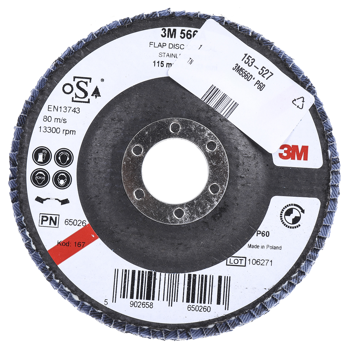 This is Zirconia Aluminium Medium Flap Disc P60 Grit 13000rpm 115mm x 22mm Bore manufactured by 3M. The manufacturer part number is 3M556D B61785. It has a standard round shape disc . The product is medium, a grade of class. The product 566a, is a highly preferred choice for users. The bore has a 22mm size. It has a maximum 13000rpm safe speed . Applications Information involves grinding and blending. It has a standard p60 grit size . Additionally, it includes a flap disc type disc . It is manufactured from rugged zirconia aluminium abrasive materials. It has a model 556d. Its overall disc diameter is 115mm .