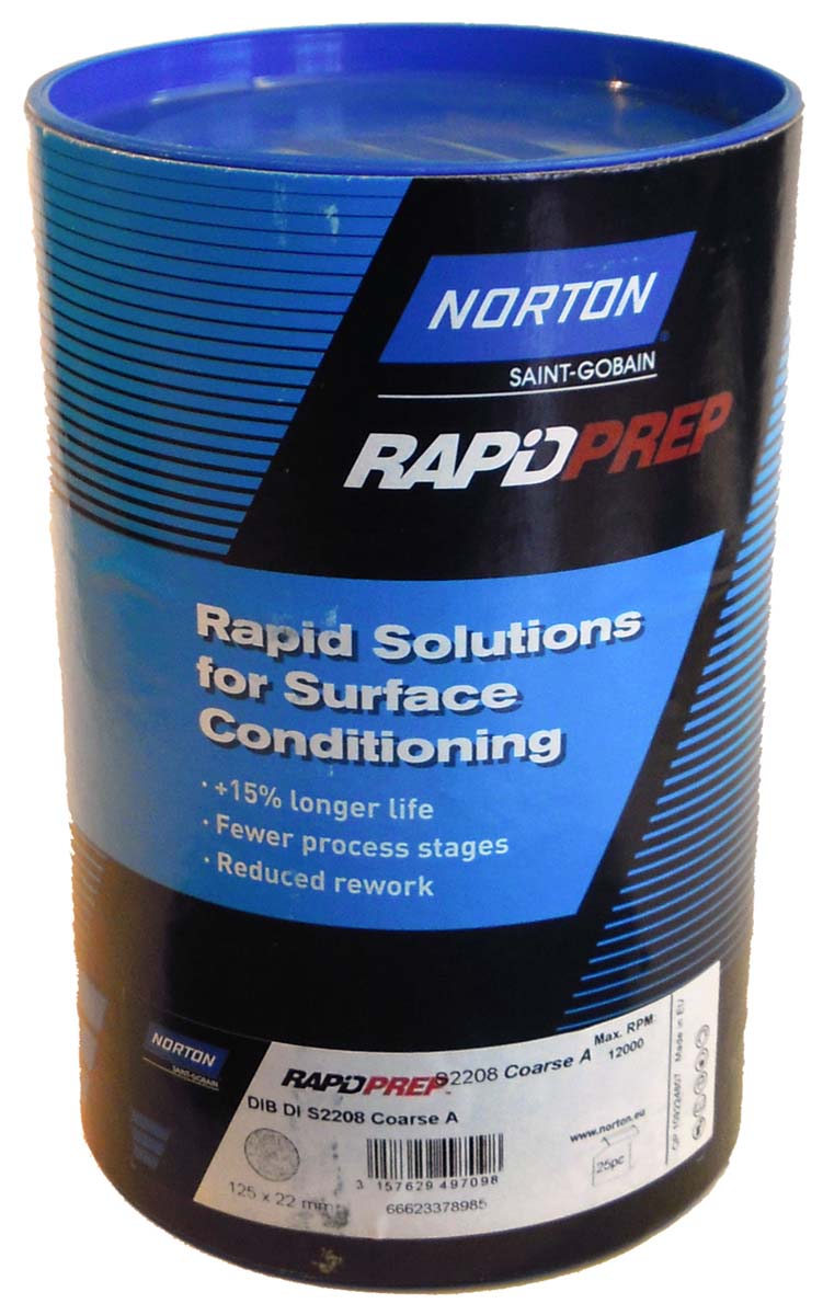 Norton Rapid Prep Conditioning Discs Professional rapid conditioning discs from Norton for surface prep that were engineered to save money and time. With reduced smearing they offer excellent performance and the thick layer of grain gives long life. The new industry-standard grit colour coding makes use and conversion easy. Hook & Loop and Speedlok options New resin system that is aerospace-tailored Proprietary new coating system Improved hook and loop backing Resists loading on aluminium and soft metals Strong fixing to rotary sanders Discs sit flatter on back-up pads, resulting in a more consistent finish on applications Applications Include blending machining marks and uneven edges, de-burring and removing surface defects, refining grind lines, casting and mould clean-up, light flash removal, applying suitable surface finish in preparation for painting