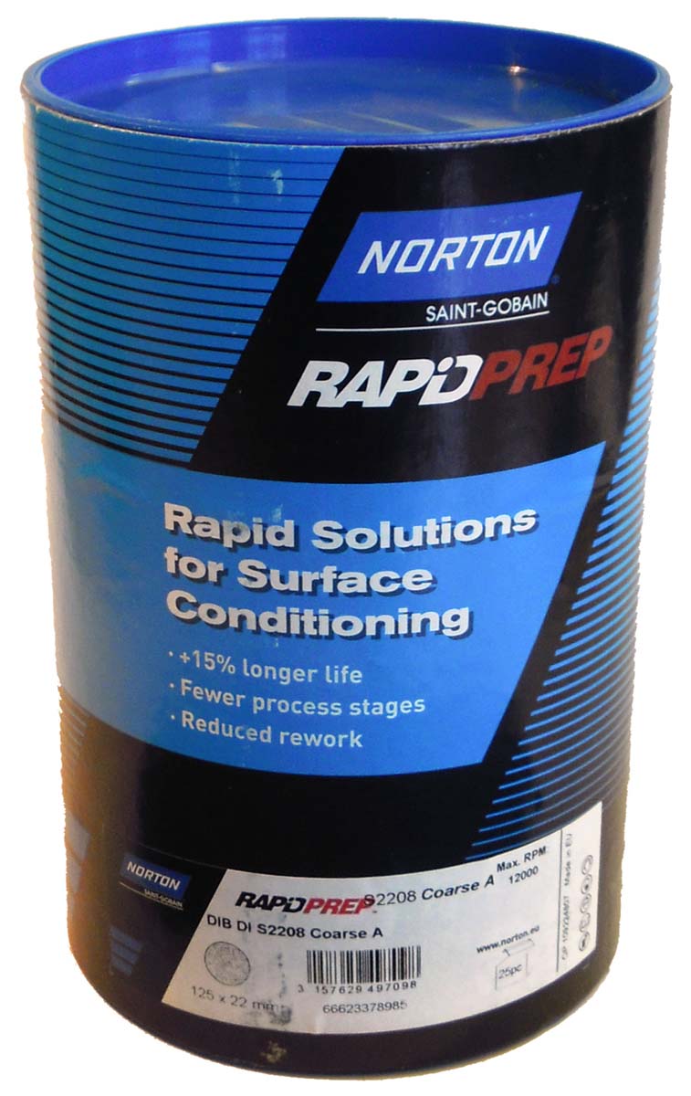 Norton Rapid Prep Conditioning Discs Professional rapid conditioning discs from Norton for surface prep that were engineered to save money and time. With reduced smearing they offer excellent performance and the thick layer of grain gives long life. The new industry-standard grit colour coding makes use and conversion easy. Hook & Loop and Speedlok options New resin system that is aerospace-tailored Proprietary new coating system Improved hook and loop backing Resists loading on aluminium and soft metals Strong fixing to rotary sanders Discs sit flatter on back-up pads, resulting in a more consistent finish on applications Applications Include blending machining marks and uneven edges, de-burring and removing surface defects, refining grind lines, casting and mould clean-up, light flash removal, applying suitable surface finish in preparation for painting.
