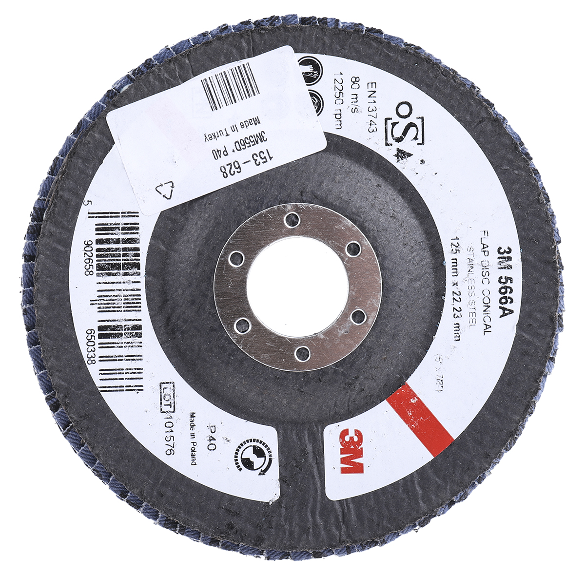 This is Zirconia Aluminium Coarse Flap Disc P40 Grit 12000rpm 125mm x 22mm Bore manufactured by 3M. The manufacturer part number is 3M556D B61792. It has a standard round shape disc . The product is coarse, a grade of class. The product 566a, is a highly preferred choice for users. The bore has a 22mm size. It has a maximum 12000rpm safe speed . Applications Information involves grinding and blending. It has a standard p40 grit size . Additionally, it includes a flap disc type disc . It is manufactured from rugged zirconia aluminium abrasive materials. It has a model pn65026. Its overall disc diameter is 125mm .