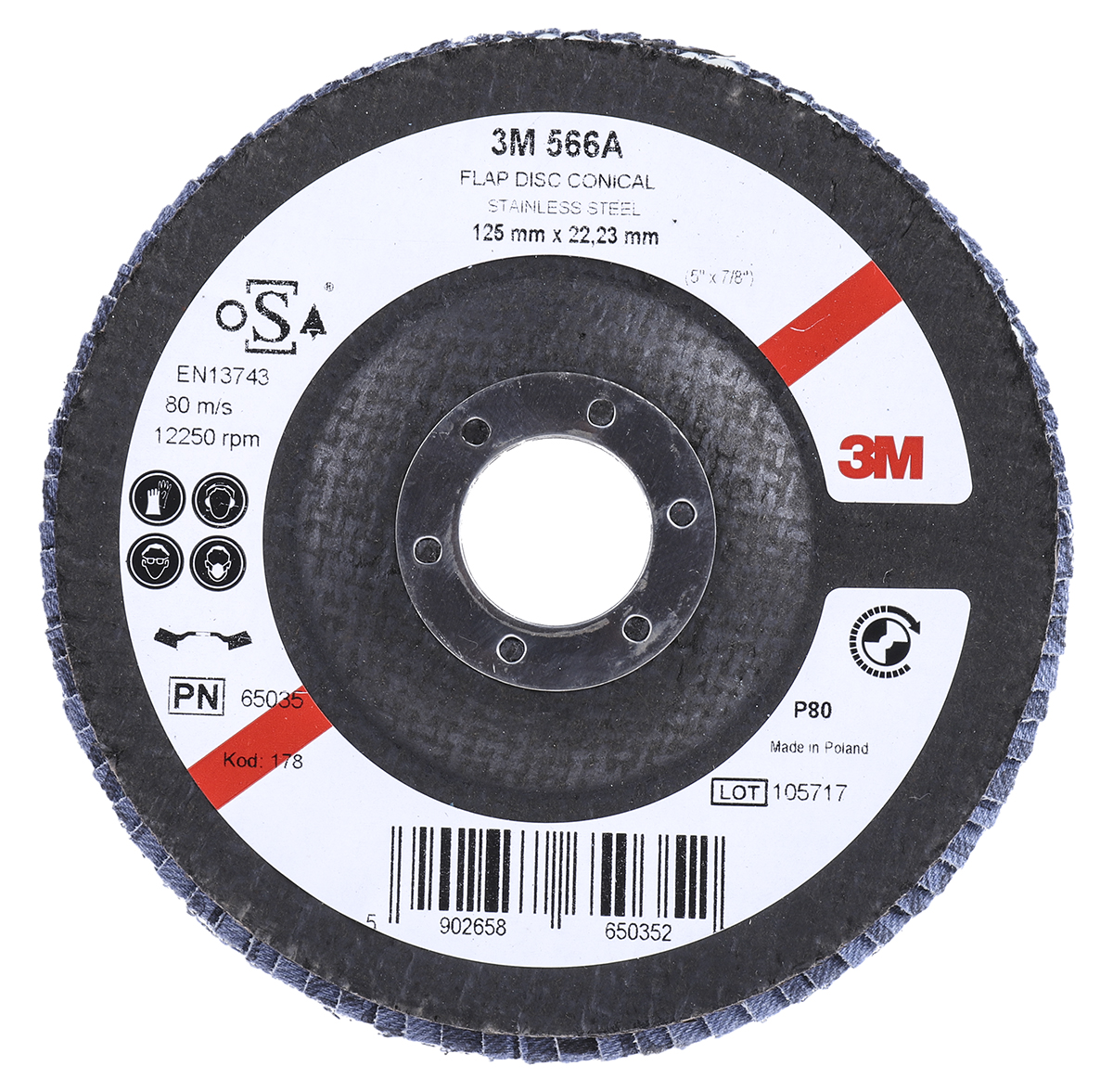 This is Zirconia Aluminium Medium Flap Disc P80 Grit 12000rpm 125mm x 22mm Bore manufactured by 3M. The manufacturer part number is 3M556A B61794. It has a standard round shape disc . It has 1 items per pack . The product is medium, a grade of class. The product 566a, is a highly preferred choice for users. The bore has a 22mm size. It has a maximum 12250rpm safe speed . Applications Information involves grinding and blending. It has a standard p80 grit size . Additionally, it includes a flap disc type disc . It is manufactured from rugged zirconia aluminium abrasive materials. It has a model pn65026. Its overall disc diameter is 125mm .