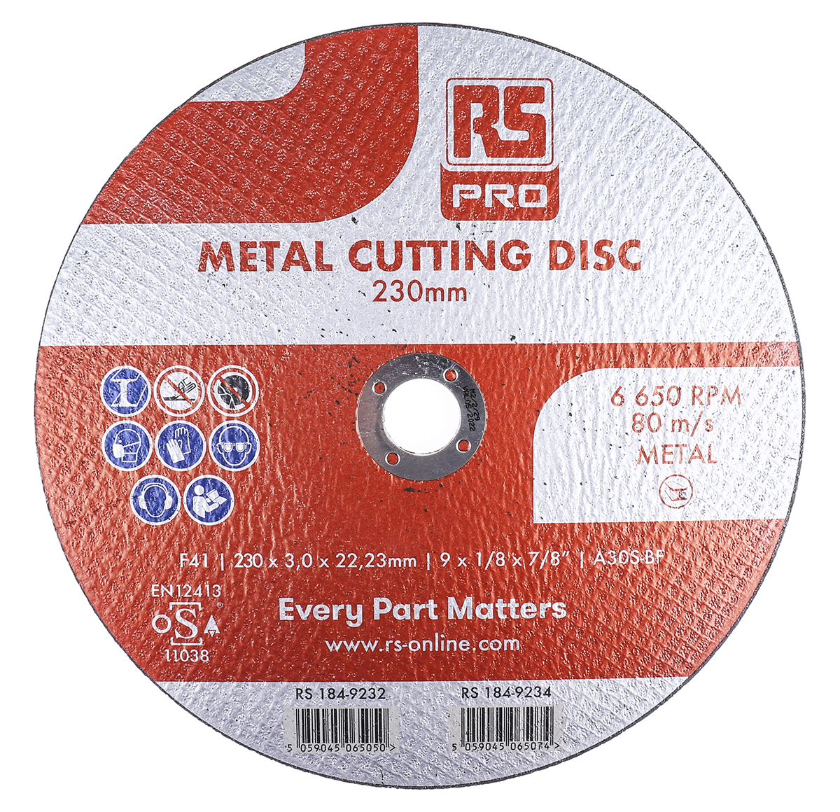 This is 230mm x 3.0mm x 22mm Metal Cutting Disc manufactured by RS PRO. The manufacturer part number is 184-9234. It has a standard round shape disc . It has 5 items per pack . It is 3mm thick. It has a standard p120 grit size . Additionally, it includes a cutting disc type disc . It is manufactured from rugged aluminium oxide abrasive materials. Its overall disc diameter is 230mm .