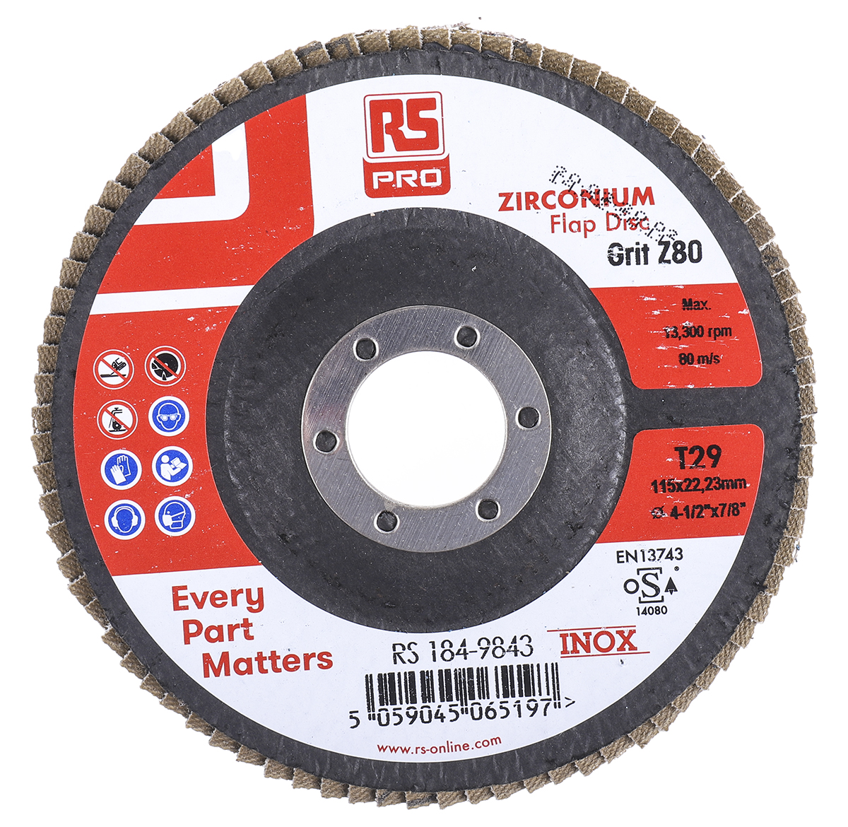 This is 115mm x 22mm Zirconium Flap Discs P80 (5 manufactured by RS PRO. The manufacturer part number is 184-9843. It has a maximum 13300rpm safe speed . The bore has a 22.23mm size. It has a standard p80 grit size . Additionally, it includes a flap disc type disc . It is manufactured from rugged zirconium dioxide abrasive materials. Its overall disc diameter is 115mm .