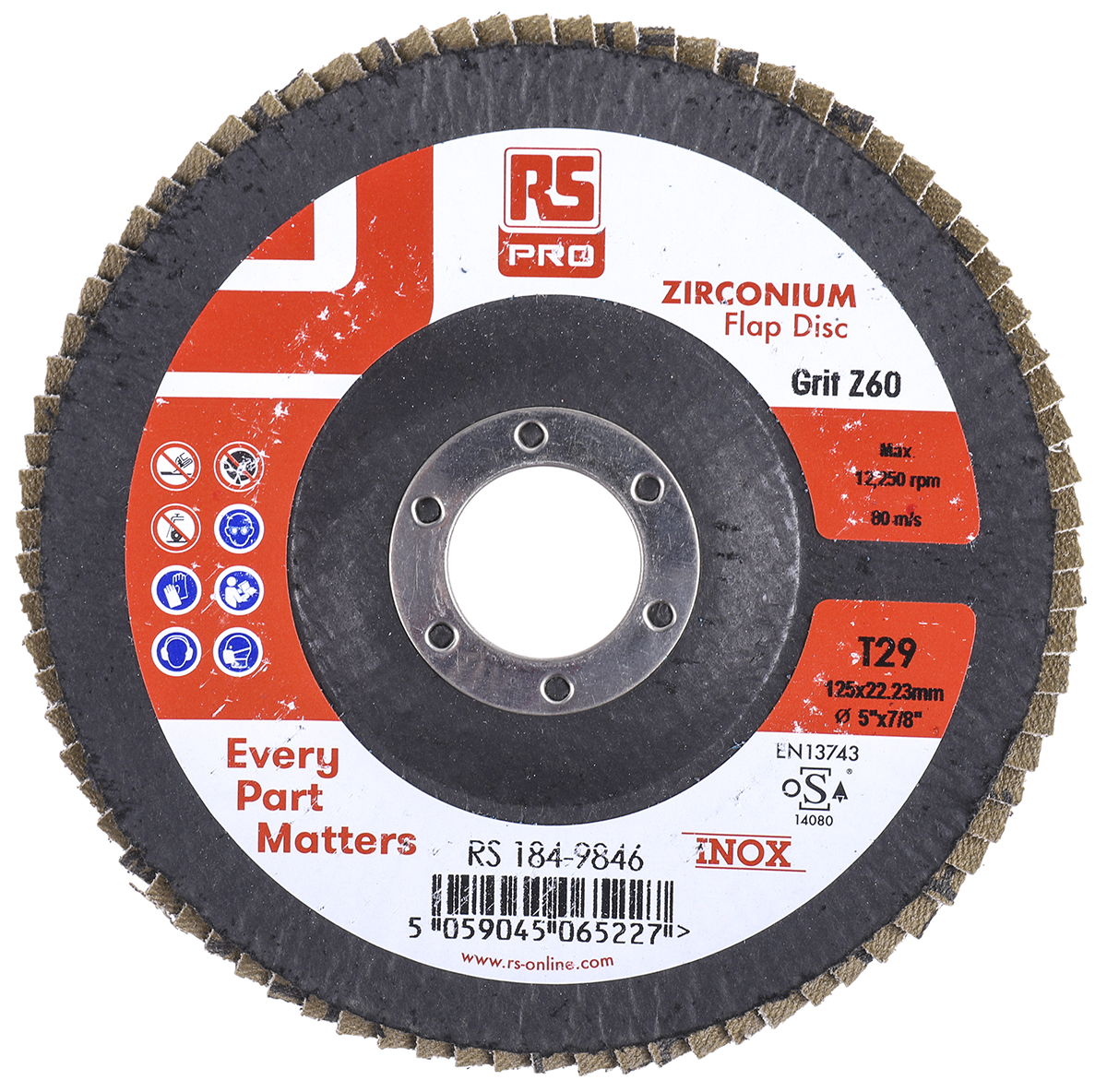 This is 125mm x 22mm Zirconium Flap Discs P60 (5 manufactured by RS PRO. The manufacturer part number is 184-9846. It has a maximum 12250rpm safe speed . It has 5 items per pack . The bore has a 22.23mm size. It has a standard p60 grit size . Additionally, it includes a flap disc type disc . It is manufactured from rugged zirconium dioxide abrasive materials. Its overall disc diameter is 125mm .