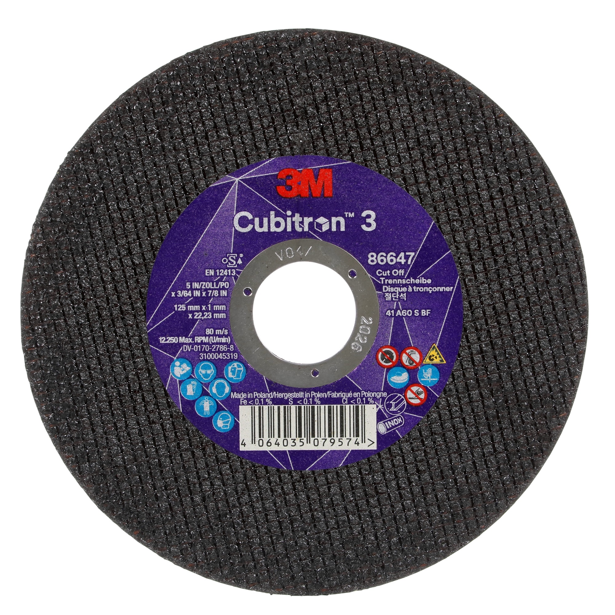 This is 86647 Cubitron 3 Ceramic Cut-Off Wheel 125mm Diameter 60+ Grit manufactured by 3M. The manufacturer part number is 7100304306. Its diameter is 125mm. It has a maximum 12250rpm safe speed . Applications Information involves metalworking, oil and gas, transportation. The product cubitron 3, is a highly preferred choice for users. The bore has a 22.23mm size. In addition, it has metal cut material . Furthermore, the product is 1mm wide. It has a standard 60+ grit size . It is manufactured from rugged ceramic abrasive materials. It has a model 86647. It has a cut-off wheel type wheel .