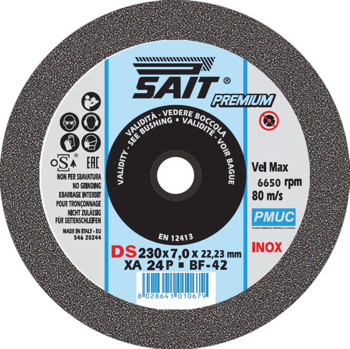 This is 100000 Grinding Wheel 230mm Diameter manufactured by SAIT. The manufacturer part number is 1000000094. It has a maximum 6650rpm safe speed . The product pmuc, is a highly preferred choice for users. The bore has a 22,23mm size. It is 7mm thick. Applications Information involves use in nuclear power station. Additionally, it includes a deburring disc type disc . It has a model 1000000094. In addition, it has stainless steel, steel cut material . Its overall disc diameter is 230mm .