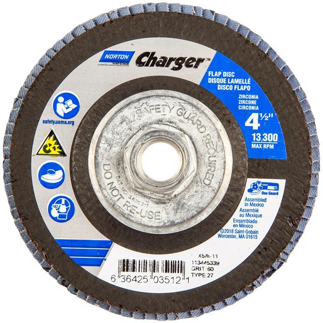 This is manufactured by Norton. The manufacturer part number is 63642503512. Its diameter is 4.50" (114.30mm). It is shipped in bulk package . It has a classic blue colour. While its abrasive grit is p60. Abrasive Grade Info: coarse. The product is widely employed in general purpose. It is manufactured from rugged zirconia alumina abrasive materials. The product is designated with the ear99 code number.