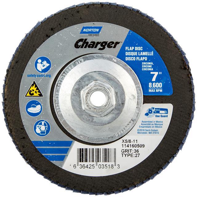 This is manufactured by Norton. The manufacturer part number is 63642503518. Its diameter is 7.00" (177.80mm). It is shipped in bulk package . It has a classic blue colour. While its abrasive grit is p36. Abrasive Grade Info: extra coarse. The product is widely employed in general purpose. It is manufactured from rugged zirconia alumina abrasive materials. The product is designated with the ear99 code number.