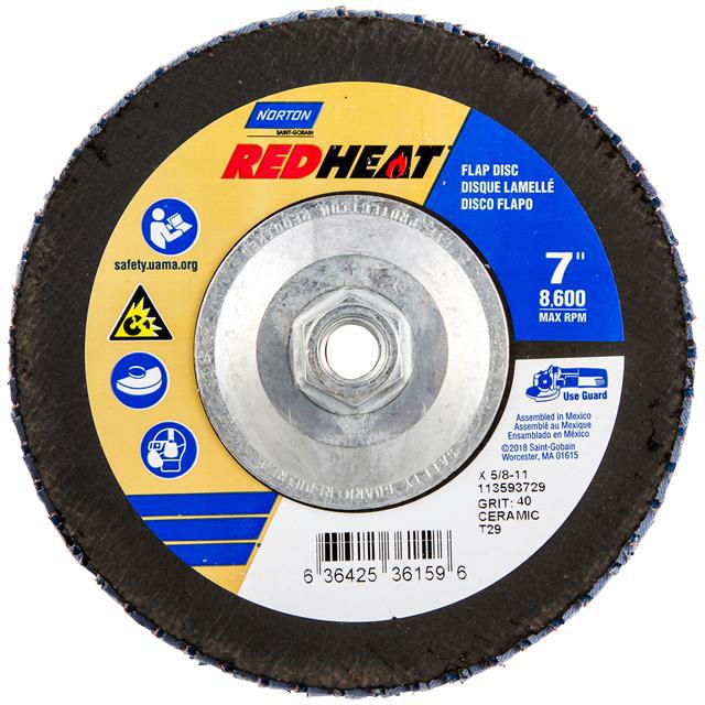 This is manufactured by Norton. The manufacturer part number is 63642536159. Its diameter is 7.00" (177.80mm). It is shipped in bulk package . It has a classic red colour. While its abrasive grit is p40. Abrasive Grade Info: extra coarse. The product is widely employed in general purpose. It is manufactured from rugged ceramic alumina abrasive materials. The product is designated with the ear99 code number.