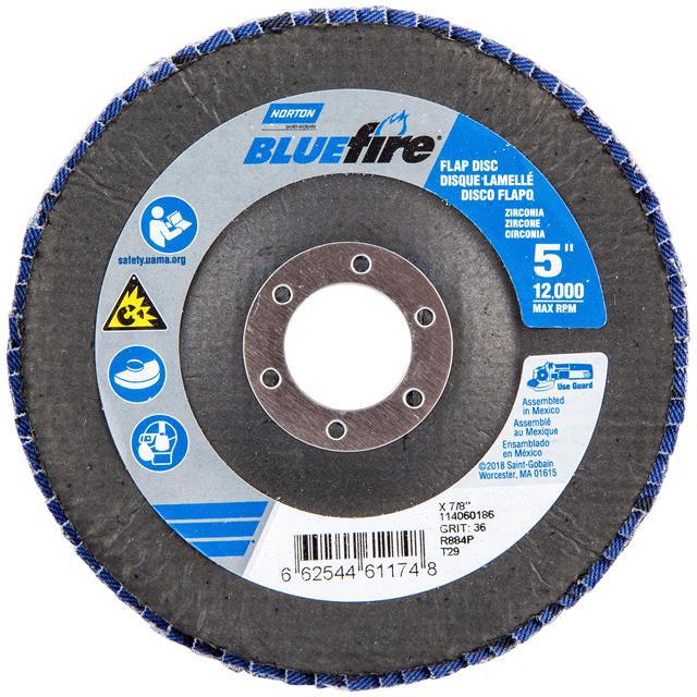 This is manufactured by Norton. The manufacturer part number is 66254461174. Its diameter is 5.00" (127.00mm). It is shipped in bulk package . It has a classic blue colour. While its abrasive grit is p36. Abrasive Grade Info: extra coarse. The product is widely employed in general purpose. It is manufactured from rugged zirconia alumina abrasive materials. The product is designated with the ear99 code number.