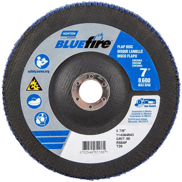 This is manufactured by Norton. The manufacturer part number is 66254461186. Its diameter is 7.00" (177.80mm). It is shipped in bulk package . It has a classic blue colour. While its abrasive grit is p80. Abrasive Grade Info: coarse. The product is widely employed in general purpose. It is manufactured from rugged zirconia alumina abrasive materials. The product is designated with the ear99 code number.