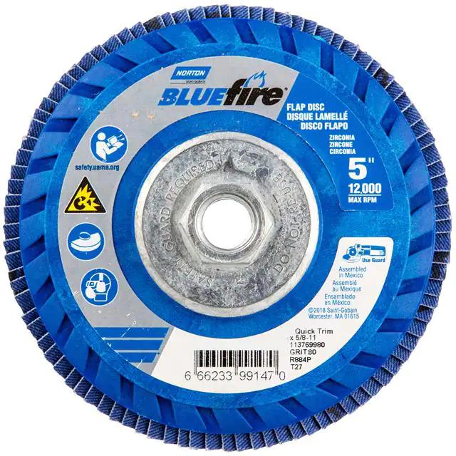 This is manufactured by Magellan Distribution. The manufacturer part number is 66623399147. Its diameter is 5.00" (127.00mm). It is assigned with possible HTSUS value of 6805.30.0000. It is shipped in bulk package . It has a classic blue colour. While its abrasive grit is p80. Abrasive Grade Info: coarse. The product is widely employed in general purpose. It is manufactured from rugged zirconia alumina abrasive materials. The product is designated with the ear99 code number.