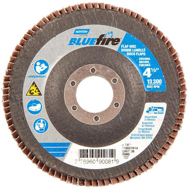 This is manufactured by Norton. The manufacturer part number is 77696090081. Its diameter is 4.50" (114.30mm). It is shipped in bulk package . It has a classic blue colour. While its abrasive grit is p36. Abrasive Grade Info: extra coarse. The product is widely employed in general purpose. It is manufactured from rugged zirconia alumina abrasive materials. The product is designated with the ear99 code number.
