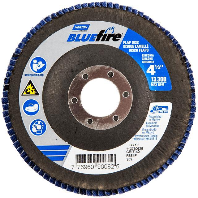 This is manufactured by Norton. The manufacturer part number is 77696090082. Its diameter is 4.50" (114.30mm). It is shipped in bulk package . It has a classic blue colour. While its abrasive grit is p40. Abrasive Grade Info: extra coarse. The product is widely employed in general purpose. It is manufactured from rugged zirconia alumina abrasive materials. The product is designated with the ear99 code number.