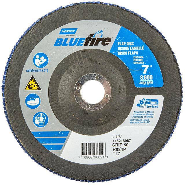 This is manufactured by Norton. The manufacturer part number is 77696090091. Its diameter is 7.00" (177.80mm). It is shipped in bulk package . It has a classic blue colour. While its abrasive grit is p80. Abrasive Grade Info: coarse. The product is widely employed in general purpose. It is manufactured from rugged zirconia alumina abrasive materials. The product is designated with the ear99 code number.