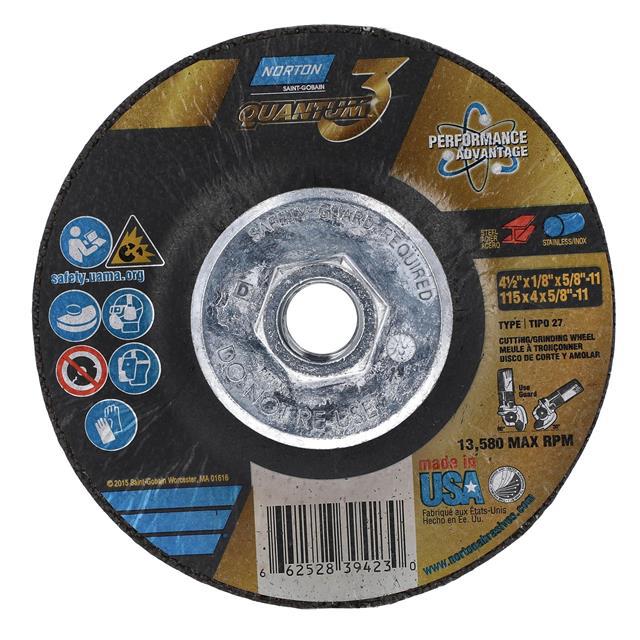 This is manufactured by Norton. The manufacturer part number is 66252839423. Its diameter is 4.50" (114.30mm). While its abrasive grit is 24. It is shipped in bulk package . It has a classic black colour. Abrasive Grade Info: coarse. Furthermore, the product is 0.13" (3.18mm) wide. The product is widely employed in general purpose. It is manufactured from rugged ceramic alumina abrasive materials. It comes in depressed center wheels configuration. The product is designated with the ear99 code number.