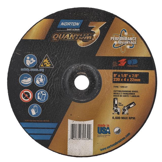 This is manufactured by Norton. The manufacturer part number is 66252839432. Its diameter is 9.00" (228.60mm). While its abrasive grit is 24. It is shipped in bulk package . It has a classic black colour. Abrasive Grade Info: coarse. Furthermore, the product is 0.13" (3.18mm) wide. The product is widely employed in general purpose. It is manufactured from rugged ceramic alumina abrasive materials. It comes in depressed center wheels configuration. The product is designated with the ear99 code number.