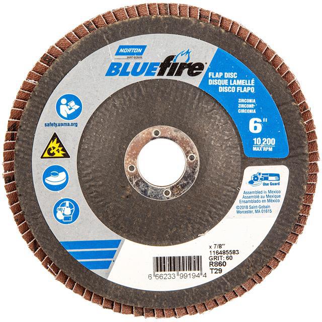 This is manufactured by Norton. The manufacturer part number is 66623399194. Its diameter is 6.00" (152.40mm). It is assigned with possible HTSUS value of 6805.30.0000. It is shipped in bulk package . It has a classic blue colour. While its abrasive grit is p60. Abrasive Grade Info: coarse. The product is widely employed in general purpose. It is manufactured from rugged zirconia alumina abrasive materials. The product is designated with the ear99 code number.