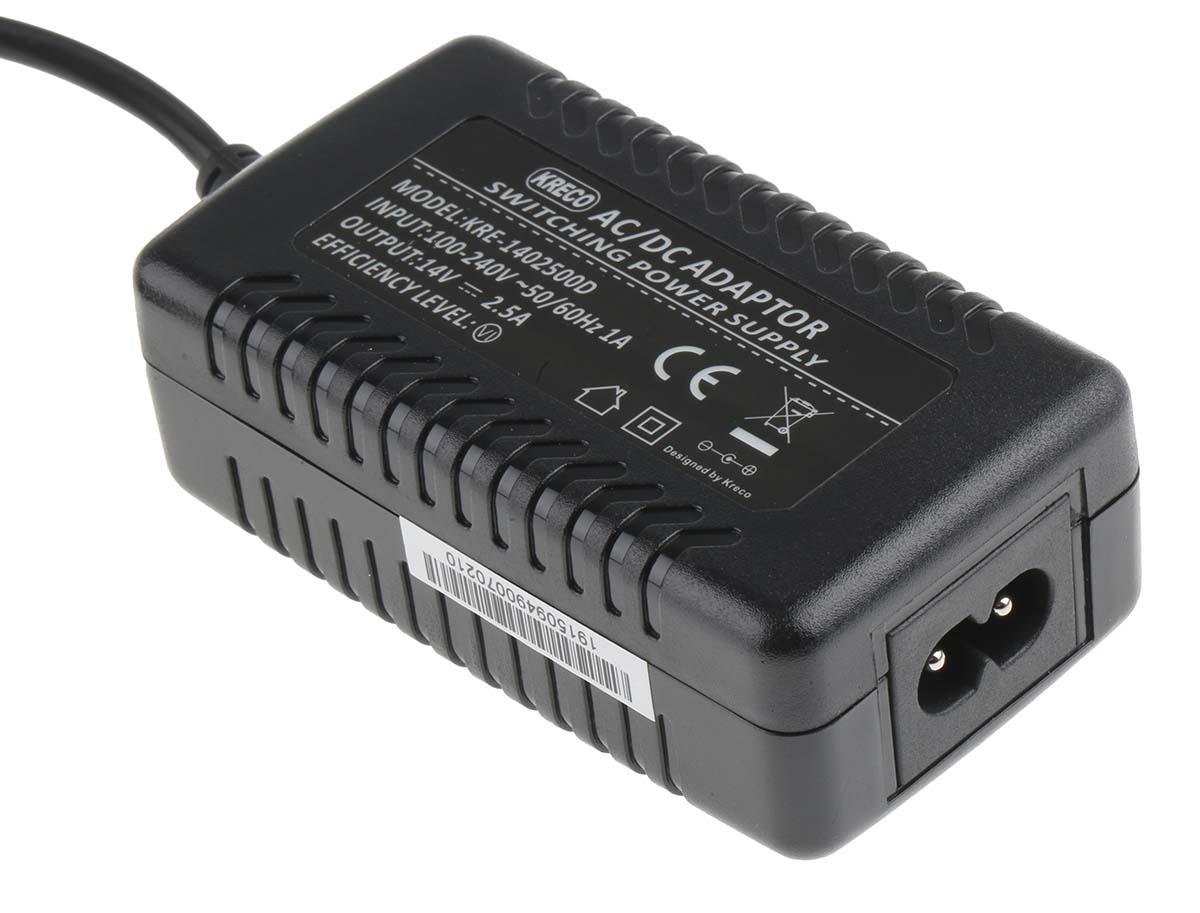 This is Power Supply manufactured by RS Pro. The manufacturer part number is 139-2349. Additionally, the product is supplied with 1 outputs. The product has +40°c maximum temperature. It carries 2.5a output current. The adapter is a plug-in adapter. While its minimum temperature is -20°c. Input connector of iec 320-c8. Its accurate length is 86mm. Its input voltage is 80 → 264v ac. Furthermore, the product is 47mm wide. The product comes in 31mm depth. The MTBF values include 50000h. Medical Approval - no. Features a 14v dc output voltage. Feature 35w of power rating. Furthermore, its energy efficiency level is vi . Furthermore, the cable has a 1.5m of length.