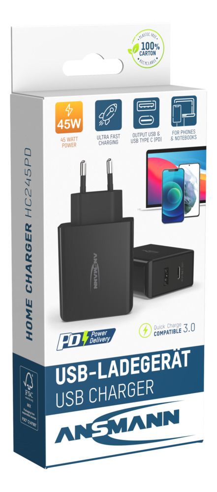 This is Lithium-Ion Battery Charger with Worldwideplug manufactured by Ansmann. The manufacturer part number is 1001-0095. Additionally, the product is supplied with 2 outputs. Load Regulation - ± 5%. The product complies with all safety standards, such as ce. It carries 2.4 → 3a output current. It is a highly efficient product with an 80.9% of high efficiency. The product has +35°c maximum temperature. The product hc245pd, is a highly preferred choice for users. Its accurate length is 96mm. Features a versatile usb, usb-c output connector. The plug is a highly reliable european plug with long service life. Furthermore, the product is 56mm wide. The product comes in 30mm depth. The adapter is a usb adapter. Features a 5 → 20 v dc output voltage. While its minimum temperature is -20°c. Feature 45w of power rating. It comes in ac/dc adapter configuration. Its input voltage is 110 → 240v ac.