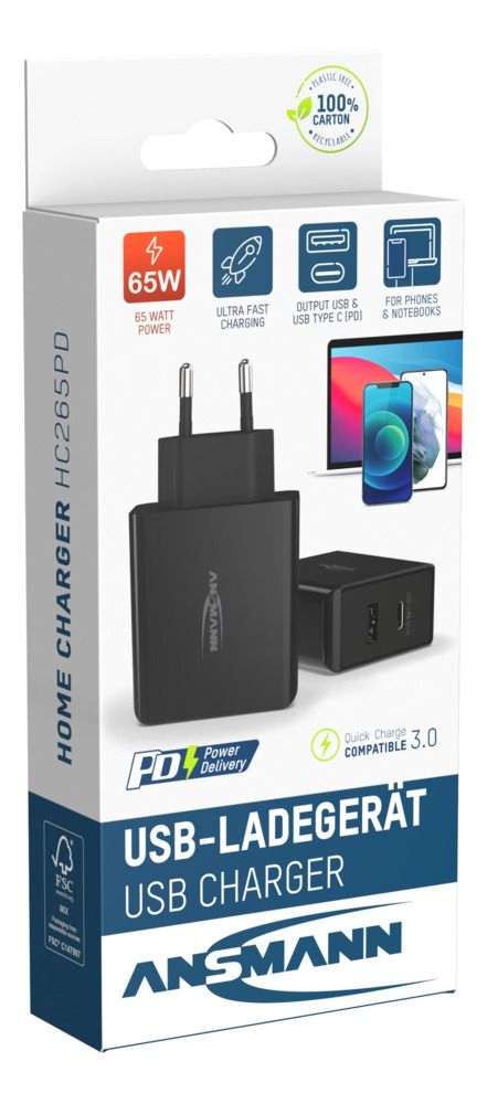 This is Battery Charger with Worldwideplug manufactured by Ansmann. The manufacturer part number is 1001-0096. Additionally, the product is supplied with 2 outputs. The product has +35°c maximum temperature. The product complies with all safety standards, such as ce. It carries 2.4 → 3.25a output current. It is a highly efficient product with an 80.9% of high efficiency. The product hc265pd, is a highly preferred choice for users. Input connector of eu plug. Its accurate length is 96mm. Features a versatile usb, usb-c output connector. The plug is a highly reliable european plug with long service life. Furthermore, the product is 56mm wide. The product comes in 30mm depth. The adapter is a usb adapter. Features a 5 → 20 v dc output voltage. While its minimum temperature is -20°c. Feature 65w of power rating. It comes in ac/dc adapter configuration. Its input voltage is 110 → 240v ac.