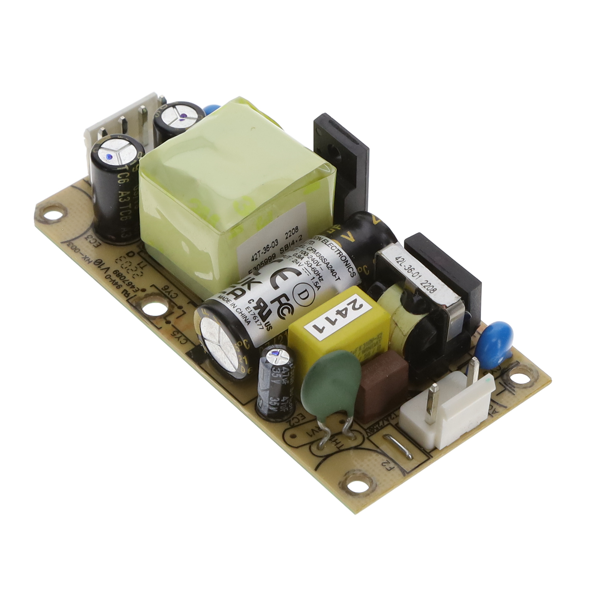 This is manufactured by Cincon Electronics Co. LTD. The manufacturer part number is CFM36SA240-T. It is assigned with possible HTSUS value of 8504.40.9510. The product is rohs3 compliant. It has a 24v output voltage. The product features power and watts of 36w. It is approved by ce, curus, demko, fcc, ukca. The possible product's input voltage is 90 ~ 264 vac, 120 ~ 370 vdc. It comes in open frame configuration. The product is widely employed in household appliances, ite (commercial). In addition, it is reach unaffected. It is a highly efficient product with an 89% of high efficiency. The product's diameters include 3.00" l x 1.50" w x 1.00" h (76.2mm x 38.1mm x 25.4mm). It has a long 10 weeks standard lead time. 4 kv of isolation voltage. Its typical moisture sensitivity level is not applicable. The splendid features of the product include universal input. The product is available in chassis mount configuration. The product cfm36s (36w), is a highly preferred choice for users. It has a 1.5 a current - output. The product has -40°c ~ 80°c (with derating) operating temperature range. In addition, box is the available packaging type of the product. Standard number include: 60335-1; 62368-1. Additionally, the product is supplied with 1 outputs. The product is designated with the ear99 code number.