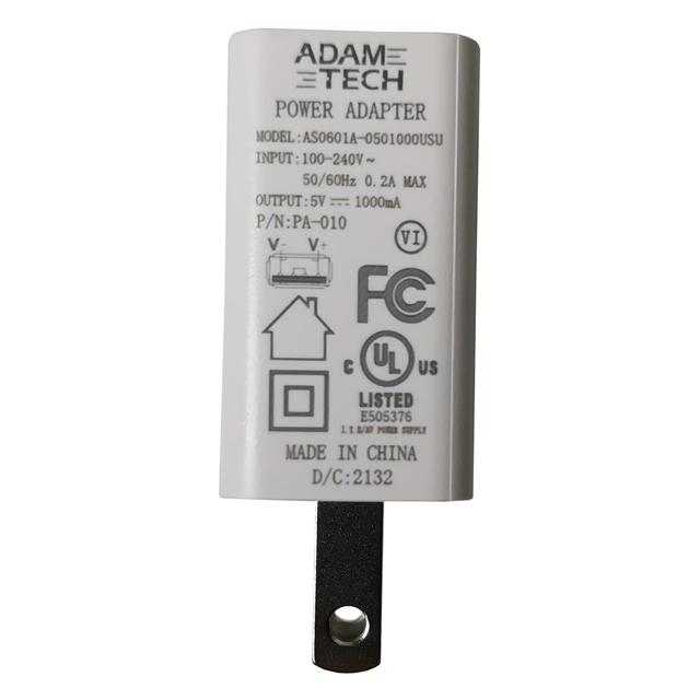 This is manufactured by Adam Tech. The manufacturer part number is PA-010. It is assigned with possible HTSUS value of 8504.40.9510. The product is rohs3 compliant. The product has 0°c ~ 45°c operating temperature range. The maximum product's output current is 1a. It is approved by culus, fcc. It carries fixed blade input type. The possible product's input voltage is 100 ~ 240 vac. The product is designed as a nice wall mount (class ii). The product is widely employed in ite (commercial). Input connector of nema 1-15p. In addition, it is reach unaffected. Features a versatile usb a receptacle output connector. It is a highly efficient product with an level vi of high efficiency. The adam tech's product offers user-desired applications. The product is utilised in various regions, including north america. The product's diameters include 1.42" l x 0.82" w x 1.42" h (36.0mm x 20.8mm x 36.0mm). It has a long 14 weeks standard lead time. Its typical moisture sensitivity level is not applicable. Furthermore, the output voltage is 5v. In addition, bag is the available packaging type of the product. The product is designated with the ear99 code number.