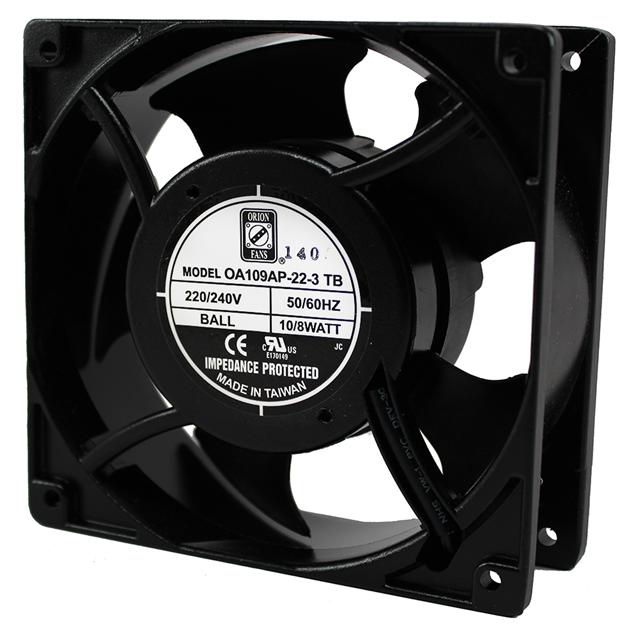 This is manufactured by Orion Fans. The manufacturer part number is OA109AP-22-3TB. The blades are constructed from robust polybutylene terephthalate (pbt) materials. It is assigned with possible HTSUS value of 8414.59.6590. The product is rohs3 compliant. Furthermore, the product is 38.50mm wide. The product features power and watts of 8.00w. It has a 51.0 cfm (1.43m³/min) air flow rate. It is approved by ce, curus, tuv, ur. While the voltage range is 160 ~ 260vac. It has noise values of 25.0db. It also exhibits voltage rating of 230vac. This product offers longer life span for 70000 hrs @ 40°c. In addition, it is reach unaffected. This has integrated with a ball, a bearing with long-lasting features. The product has -4 ~ 167°f (-20 ~ 75°c) operating temperature range. It provides maximum rpm up to 1600 rpm. The orion fans's product offers user-desired applications. The product has a 0.150 in h2o (37.4 pa) static pressure. The product's diameters include square - 120mm l x 120mm h. The product features 2 terminals termination style. It has a long 19 weeks standard lead time. Its typical moisture sensitivity level is not applicable. The typical product's weight is 1.2 lbs (544.3 g). The product oa109, is a highly preferred choice for users. The frame of the product is made from highly durable aluminum materials. In addition, box is the available packaging type of the product. The latest designed fan is a type of tubeaxial offering unmatchable applications. Moreover, it corresponds to oa109ap, a base product number of the product. The product is designated with the ear99 code number.