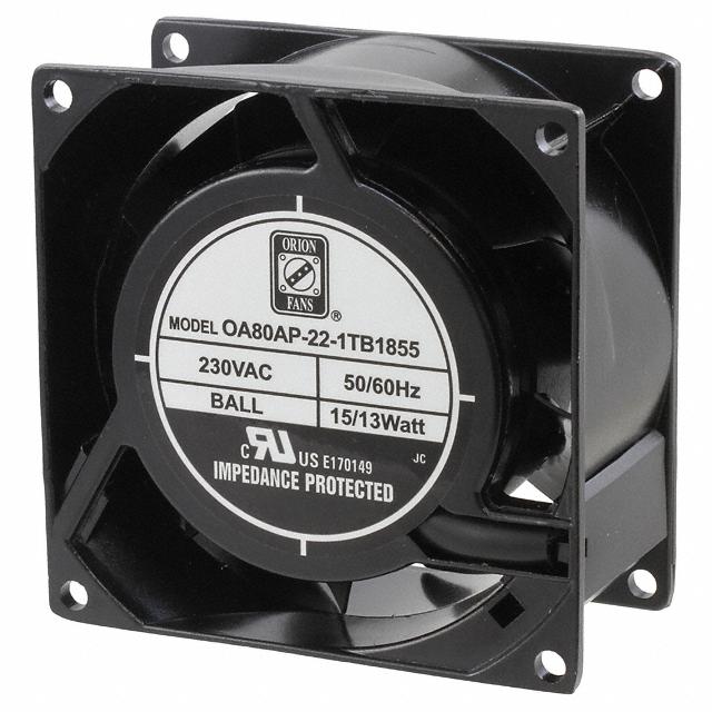 This is manufactured by Orion Fans. The manufacturer part number is OA80AP-22-1TB1855. The blades are constructed from robust metal materials. It is assigned with possible HTSUS value of 8414.59.6590. The product is rohs3 compliant. Furthermore, the product is 38.00mm wide. The product features power and watts of 13.00w. It has a 33.0 cfm (0.924m³/min) air flow rate. It is approved by curus, tuv. While the voltage range is 200 ~ 240vac. It has noise values of 35.0db. It also exhibits voltage rating of 230vac. In addition, it is reach unaffected. This has integrated with a ball, a bearing with long-lasting features. The product has -22 ~ 176°f (-30 ~ 80°c) operating temperature range. It provides maximum rpm up to 3200 rpm. This product offers longer life span for 50000 hrs @ 55°c. The product has a 0.220 in h2o (54.8 pa) static pressure. It is shipped in box package . The product's diameters include square - 80mm l x 80mm h. The product features 2 terminals termination style. It has a long 19 weeks standard lead time. Its typical moisture sensitivity level is 1 (unlimited). It is IP rated with ip55 - dust protected, water resistant. The typical product's weight is 0.95 lb (430.91 g). The product oa80, is a highly preferred choice for users. The frame of the product is made from highly durable aluminum materials. The latest designed fan is a type of tubeaxial offering unmatchable applications. Moreover, it corresponds to oa80ap, a base product number of the product. The product is designated with the ear99 code number.