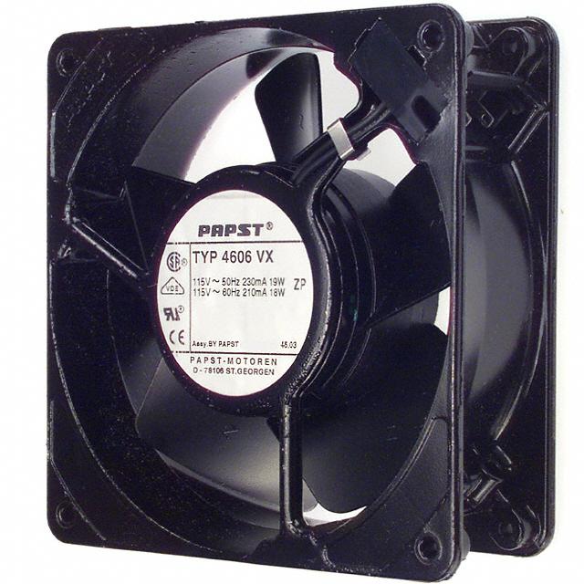This is manufactured by ebm-papst Inc.. The manufacturer part number is 4606VX. The blades are constructed from robust metal materials. It is assigned with possible HTSUS value of 8414.59.6590. Furthermore, the product is 38.00mm wide. The product features power and watts of 18.00w. It has a 106.0 cfm (2.97m³/min) air flow rate. It is approved by ce, csa, ul, vde. It has noise values of 45.0db(a). It also exhibits voltage rating of 115vac. In addition, it is reach unaffected. This has integrated with a ball, a bearing with long-lasting features. The ebm-papst inc.'s product offers user-desired applications. The product's diameters include square - 119mm l x 119mm h. The product features 2 terminals termination style. Its typical moisture sensitivity level is 1 (unlimited). The typical product's weight is 1.1 lbs (499.0 g). The product 4000vx, is a highly preferred choice for users. The frame of the product is made from highly durable metal materials. The latest designed fan is a type of tubeaxial offering unmatchable applications. The product is designated with the ear99 code number.