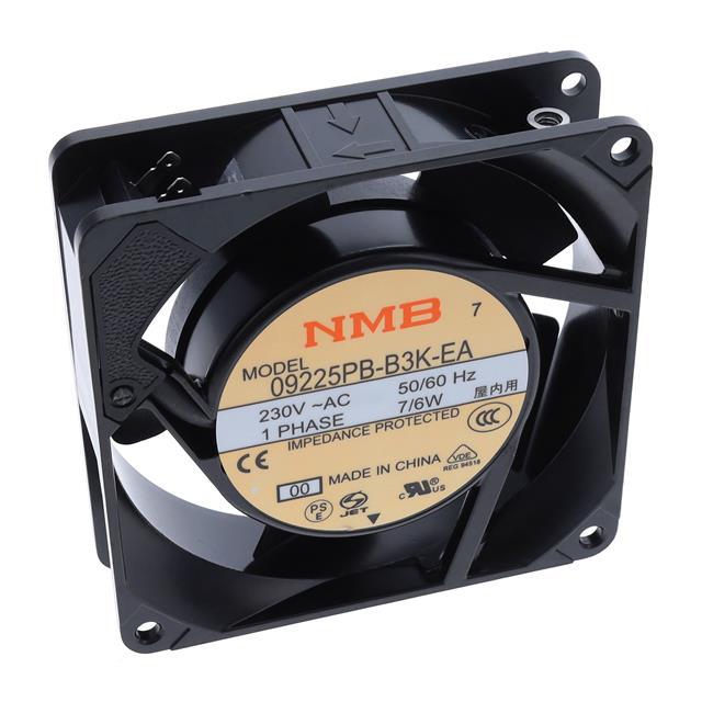 This is manufactured by NMB Technologies Corporation. The manufacturer part number is 09225PB-B3K-EA-00. The blades are constructed from robust plastic materials. It is assigned with possible HTSUS value of 8414.59.6590. The product is rohs3 compliant. Furthermore, the product is 25.00mm wide. The product features power and watts of 6.00w. It has a 28.0 cfm (0.784m³/min) air flow rate. It has noise values of 35.0db. It also exhibits voltage rating of 230vac. This product offers longer life span for 100000 hrs @ 25°c. This has integrated with a ball, a bearing with long-lasting features. The product has 14 ~ 158°f (-10 ~ 70°c) operating temperature range. It provides maximum rpm up to 2500 rpm. The nmb technologies corporation's product offers user-desired applications. The product has a 0.160 in h2o (39.8 pa) static pressure. The product's diameters include square - 92.5mm l x 92.5mm h. The product features 2 terminals termination style. It has a long 22 weeks standard lead time. Additionally, the product's output is 0.050a. Its typical moisture sensitivity level is not applicable. The product 09225pb, is a highly preferred choice for users. The frame of the product is made from highly durable aluminum materials. In addition, bulk is the available packaging type of the product. The latest designed fan is a type of tubeaxial offering unmatchable applications. The product is designated with the ear99 code number.