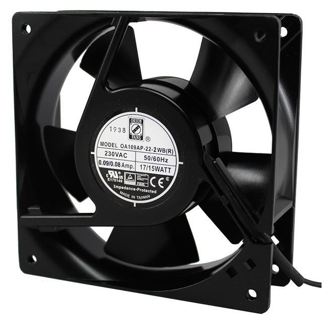 This is manufactured by Orion Fans. The manufacturer part number is OA109AP-22-2WBR. The blades are constructed from robust polybutylene terephthalate (pbt) materials. It is assigned with possible HTSUS value of 8414.59.6590. The product is rohs3 compliant. Furthermore, the product is 38.50mm wide. The product features power and watts of 13.00w. It has a 85.0 cfm (2.38m³/min) air flow rate. It is approved by curus, tuv. While the voltage range is 160 ~ 260vac. It has noise values of 45.0db(a). It also exhibits voltage rating of 230vac. This product offers longer life span for 60000 hrs @ 40°c. In addition, it is reach unaffected. This has integrated with a ball, a bearing with long-lasting features. The product has -4 ~ 176°f (-20 ~ 80°c) operating temperature range. It provides maximum rpm up to 2750 rpm. The orion fans's product offers user-desired applications. The product has a 0.250 in h2o (62.3 pa) static pressure. The product's diameters include square - 119.5mm l x 119.5mm h. The product features 2 wire leads termination style. It has a long 2 weeks standard lead time. Its typical moisture sensitivity level is not applicable. The product oa109ap, is a highly preferred choice for users. The frame of the product is made from highly durable aluminum materials. In addition, bulk is the available packaging type of the product. The latest designed fan is a type of tubeaxial offering unmatchable applications. The product is designated with the ear99 code number.